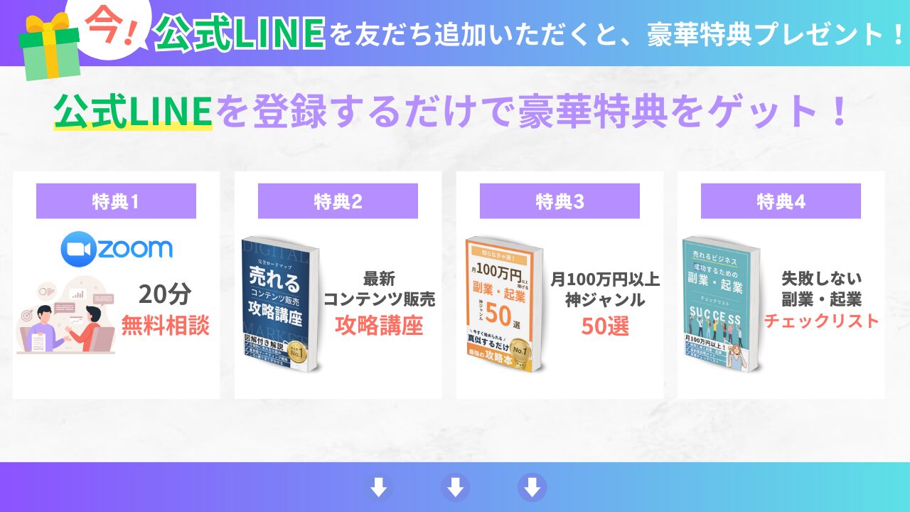 今なら公式LINEを登録するだけで、副業・コンテンツ販売・ビジネス自動化を加速させる4大特典を無料で受け取れます!