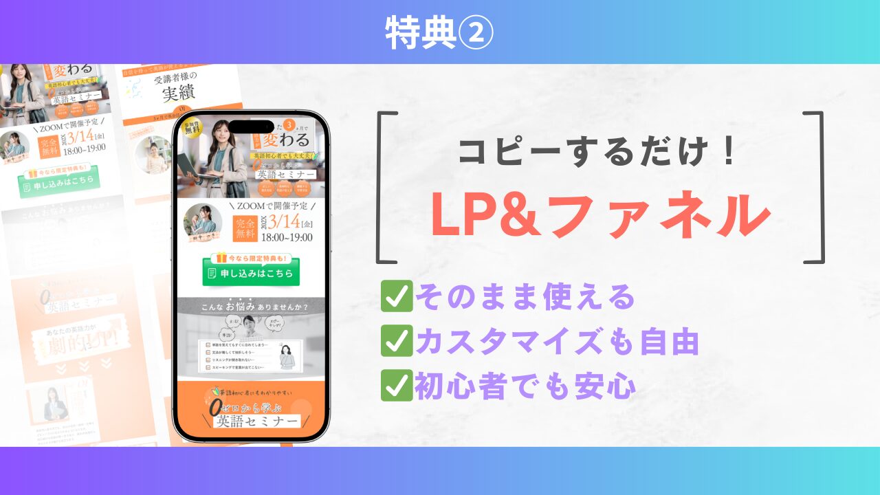 この特典では、コピーするだけで使えるLP&ファネルテンプレートを特別にご用意しました!